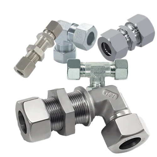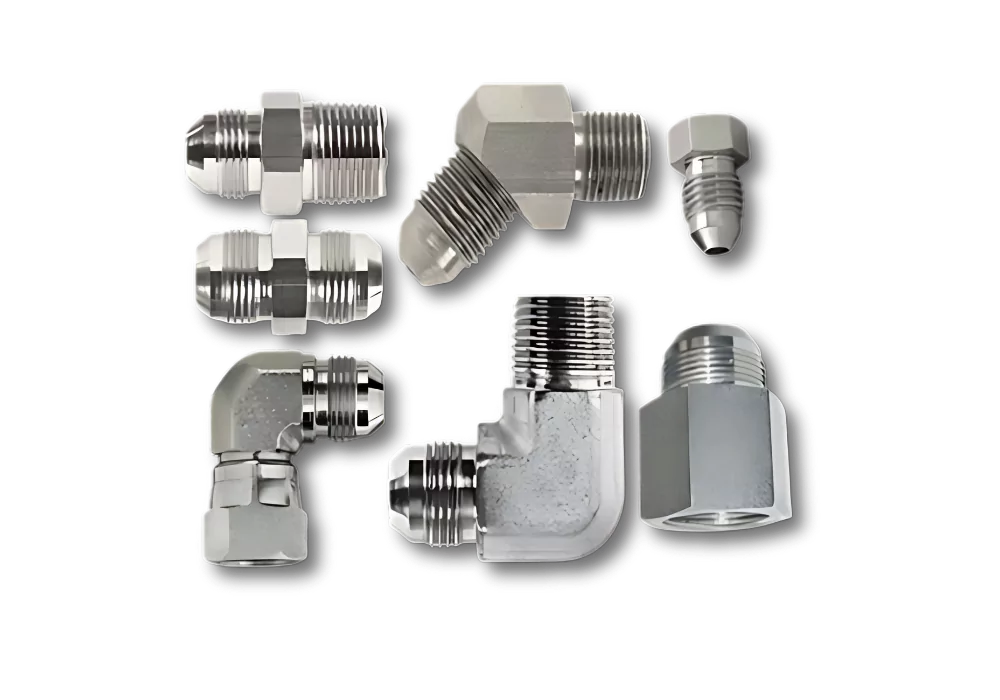 Flared fittings with 37° seat, used for high-pressure fluid power connections.
